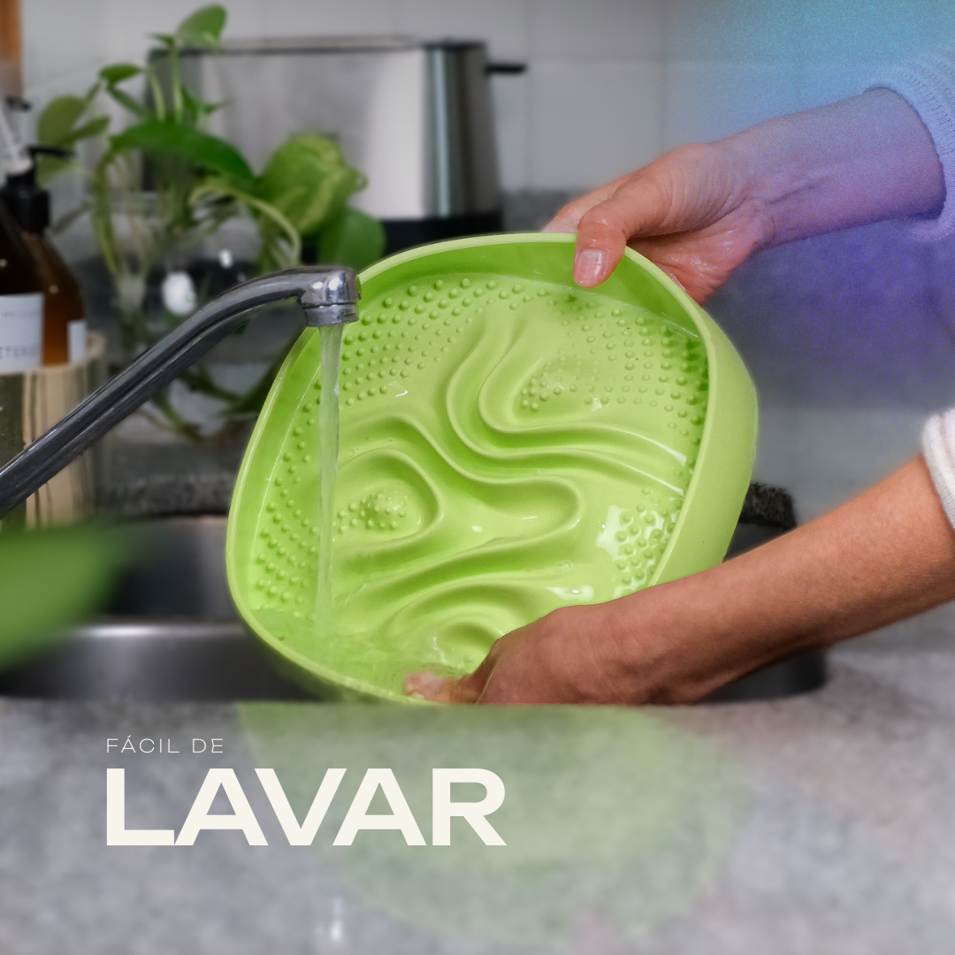 Su diseño inteligente con paredes laterales permite servir raciones diarias completas sin desbordes, mientras que sus texturas internas ofrecen distintos niveles de dificultad para prolongar la ingesta y mejorar la digestión.